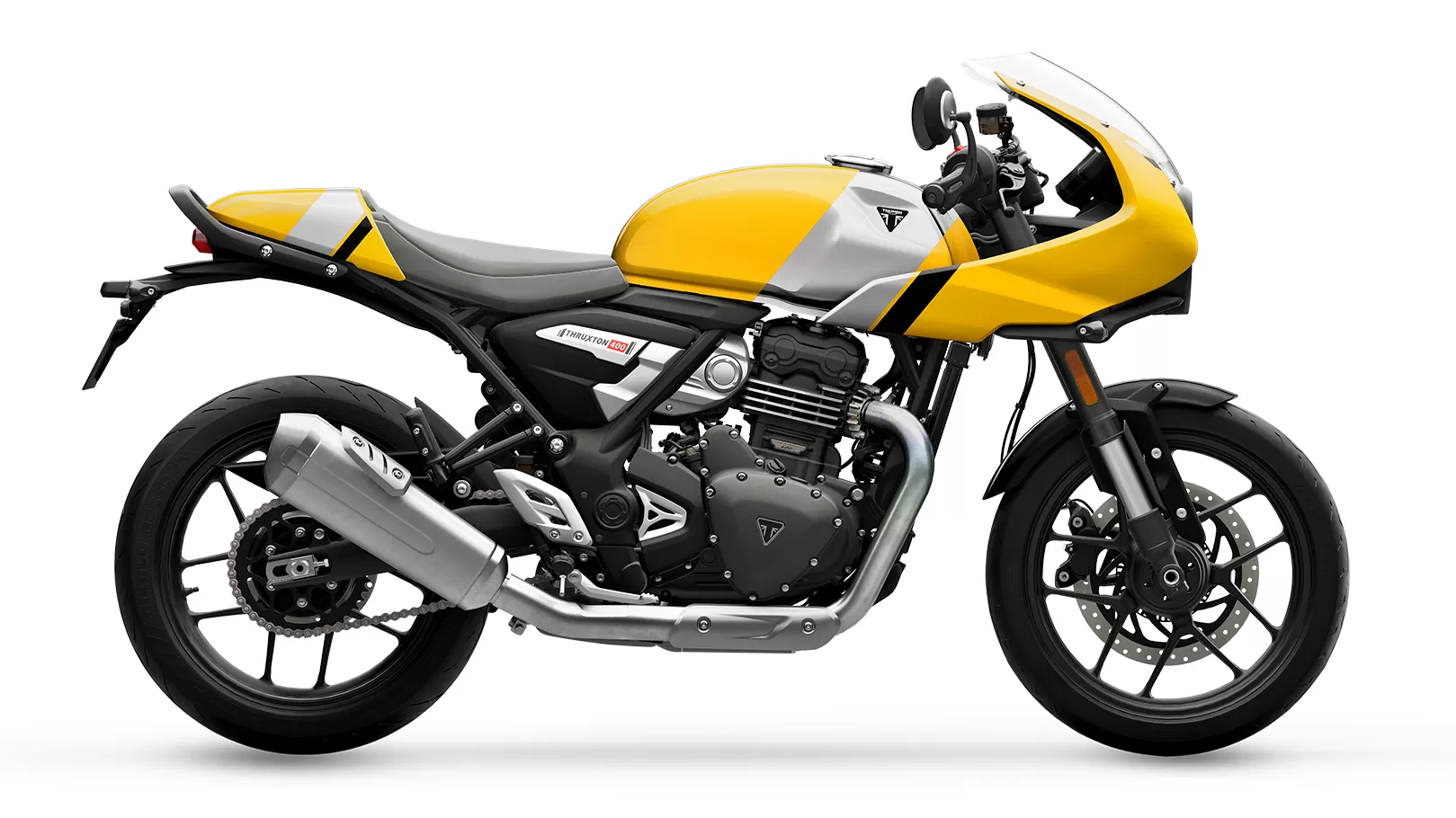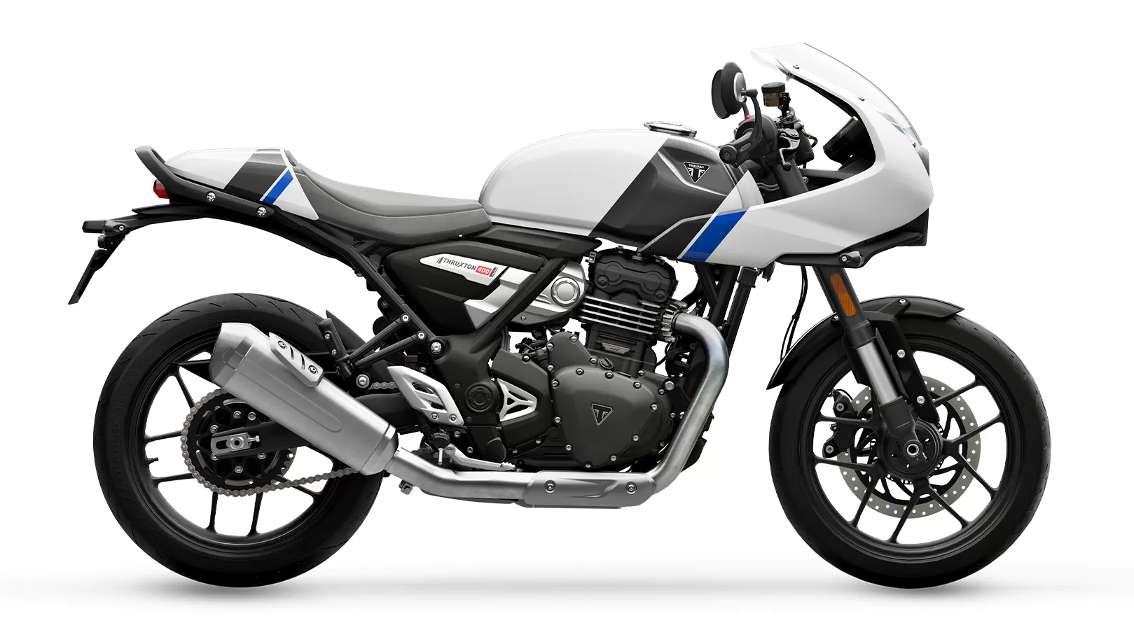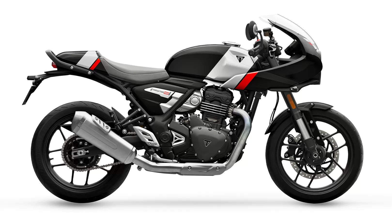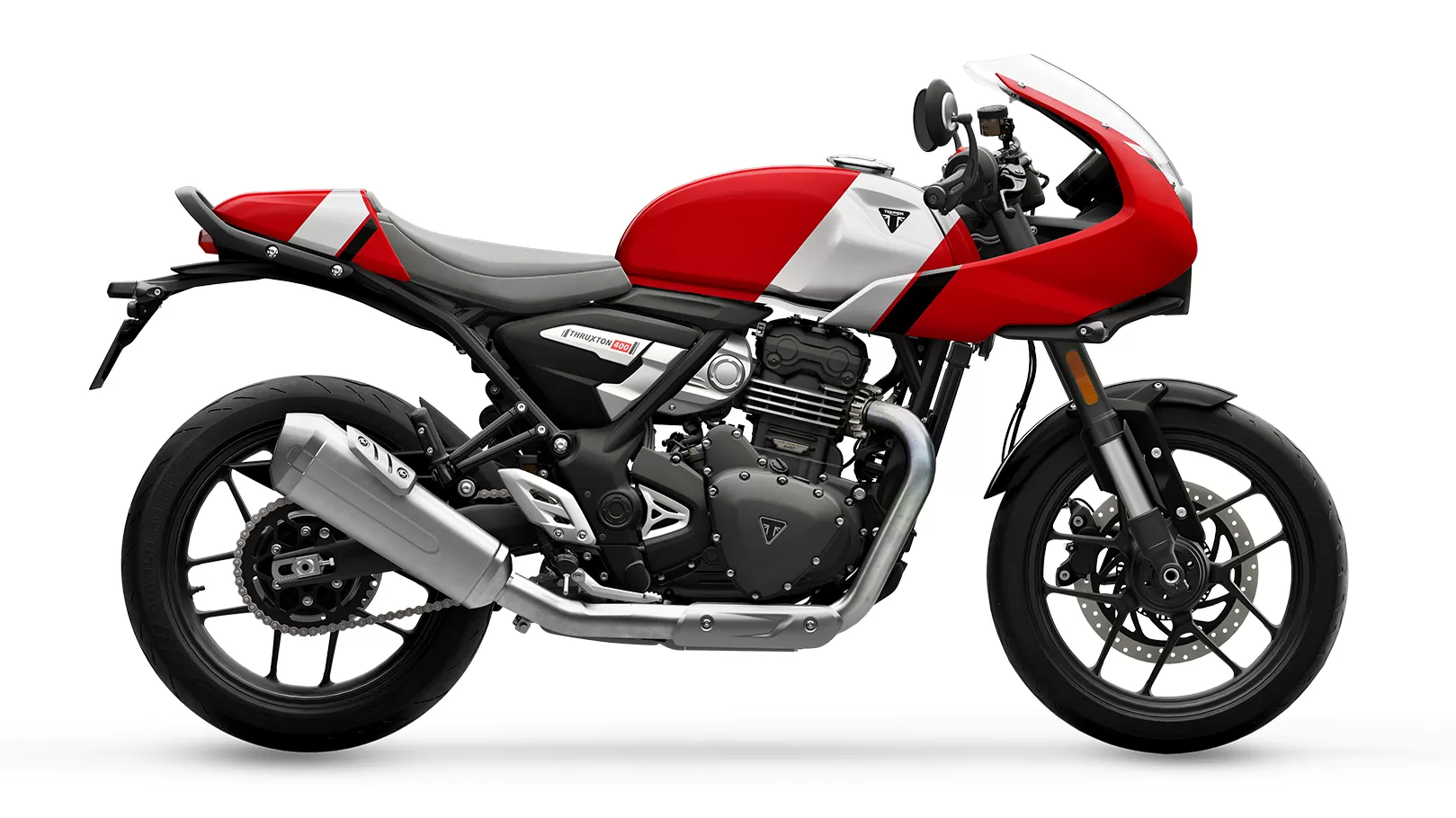 Four vibrant colour schemes feature sleek graphics and sporty contrast accents on the fuel tank, fairing and seat cowl, while the Matt Phantom Black side panel carries an aluminium finish badge bearing the Thruxton name.